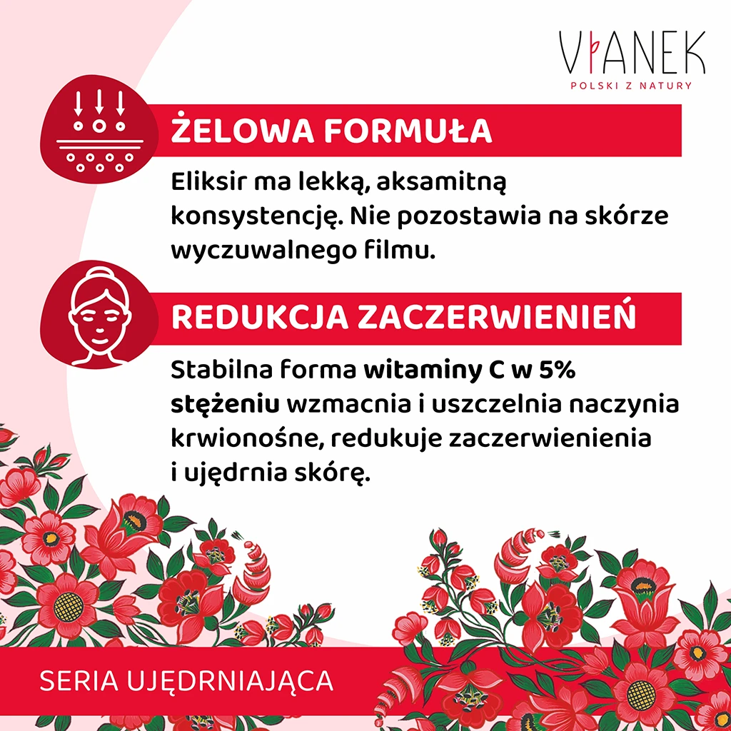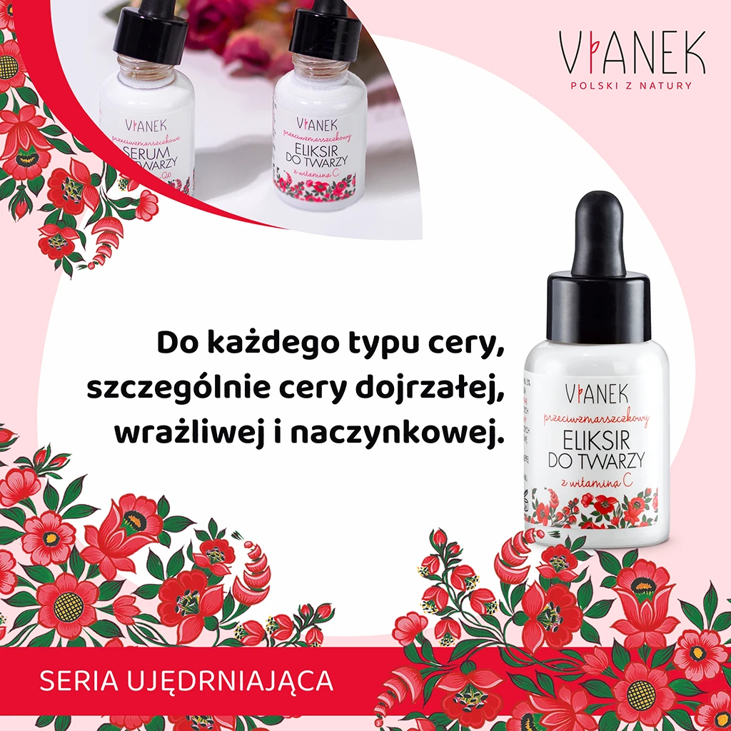 Odkryj tajemnicę wiecznie młodej skóry z naszym przeciwzmarszczkowym eliksirem do Twarzy VIANEK! Bez względu na typ cery, nasz eliksir jest stworzony z myślą o Tobie – szczególnie jeśli Twoja skóra jest wrażliwa, naczynkowa i wymaga wyjątkowej troski.