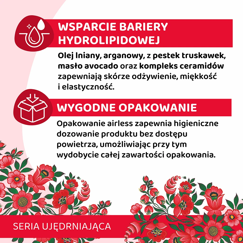Dostarcz swojej skórze wsparcia dzięki kompleksowi odżywczych olejów: lnianego, arganowego, z pestek truskawek oraz masła avocado. W połączeniu z kompleksem ceramidów, te cenne składniki wzmacniają barierę hydrolipidową skóry, zapewniając jej miękkość, elastyczność oraz zdrowy wygląd.