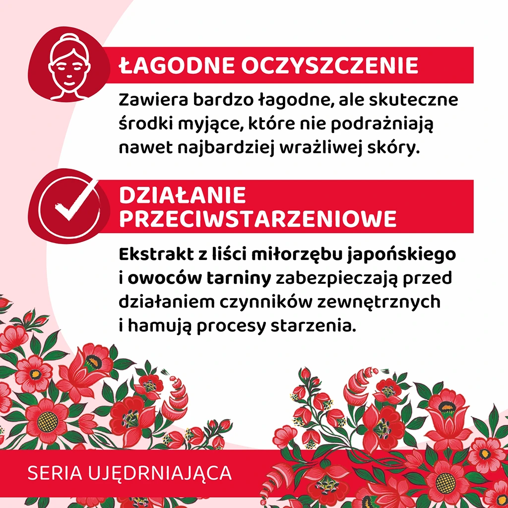 Delikatny płyn micelarny dokładnie usuwa makijaż twarzy i okolic oczu, nie podrażniając nawet wrażliwej cery. Zawiera ekstrakty z liści miłorzębu japońskiego i owoców tarniny, które zabezpieczają przed działaniem czynników zewnętrznych i powstrzymują procesy starzenia. W połączeniu z olejem z wiesiołka i witaminą E pozwala na skuteczny demakijaż bez naruszenia płaszcza hydrolipidowego. Po użyciu płynu pozostawia przyjemne uczucie komfortu i świeżości.