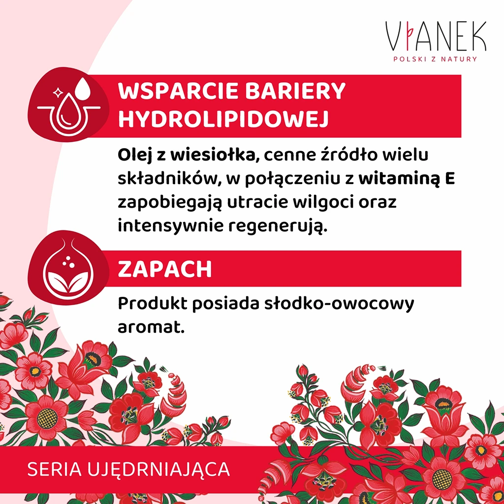 Nawilżenie to klucz do zachowania pięknej skóry. Olej z wiesiołka, bogate źródło cennych składników, w połączeniu z witaminą E, nie tylko zapobiegają utracie wilgoci, ale również intensywnie regenerują skórę. Produkt posiada delikatny, słodko-owocowy aromat, który sprawia, że każda chwila oczyszczania staje się wyjątkowym rytuałem pielęgnacyjnym.