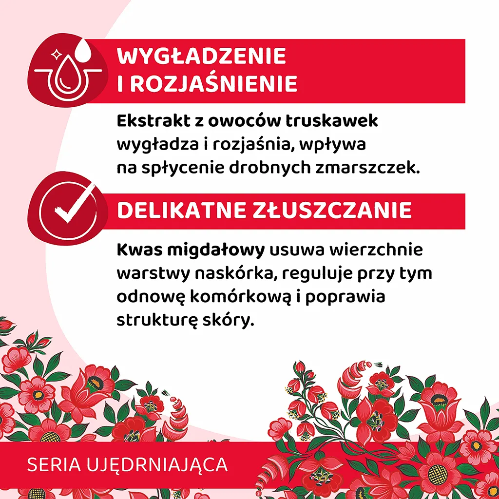 Składniki wiodące | Ekstrakt z truskawek, Kwas migdałowy, Panthenol |