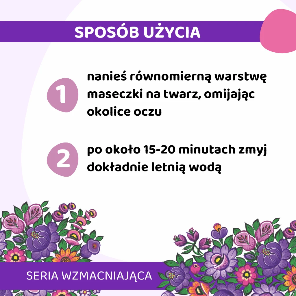 Twoja skóra wymaga wyjątkowej troski. Nasza wzmacniająca maska do twarzy, skomponowana z naturalnych składników, stanowi klucz do uzyskania promiennej skóry, niezależnie od rodzaju cery. Jest szczególnie skuteczna w przypadku skóry wrażliwej, naczynkowej, skłonnej do trądziku różowatego. Jej delikatna formuła oraz przyjemny, słodki zapach sprawiają, że pielęgnacja zamienia się w chwilę relaksu i odprężenia.