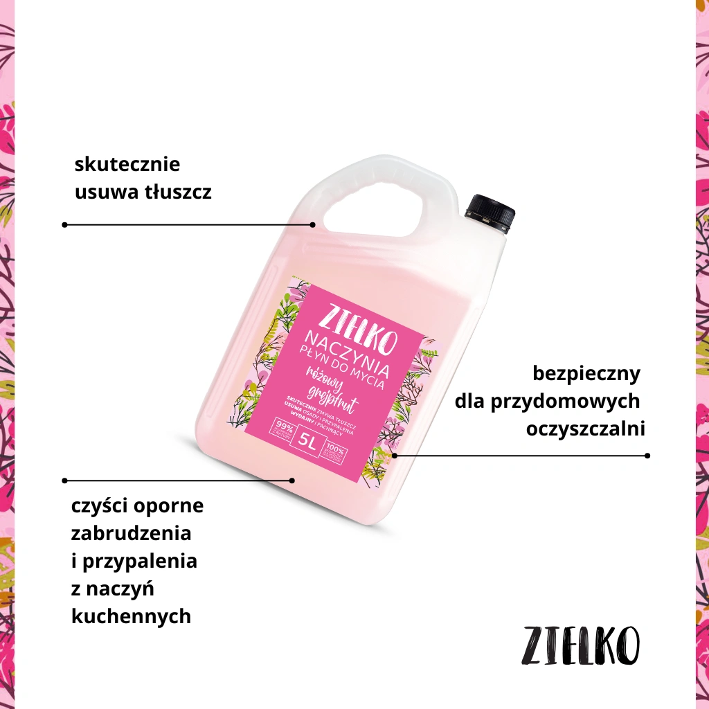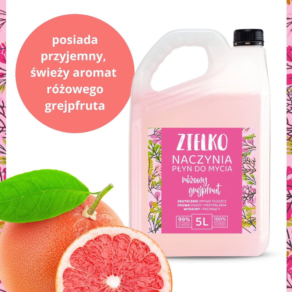 Płyn do naczyń ZIELKO urzeka orzeźwiającym aromatem różowego grejpfruta, który na długo wypełnia kuchnię przyjemnym zapachem czystości. Dzięki niemu codzienne mycie naczyń staje się nie tylko skuteczne, ale i wyjątkowo relaksujące.