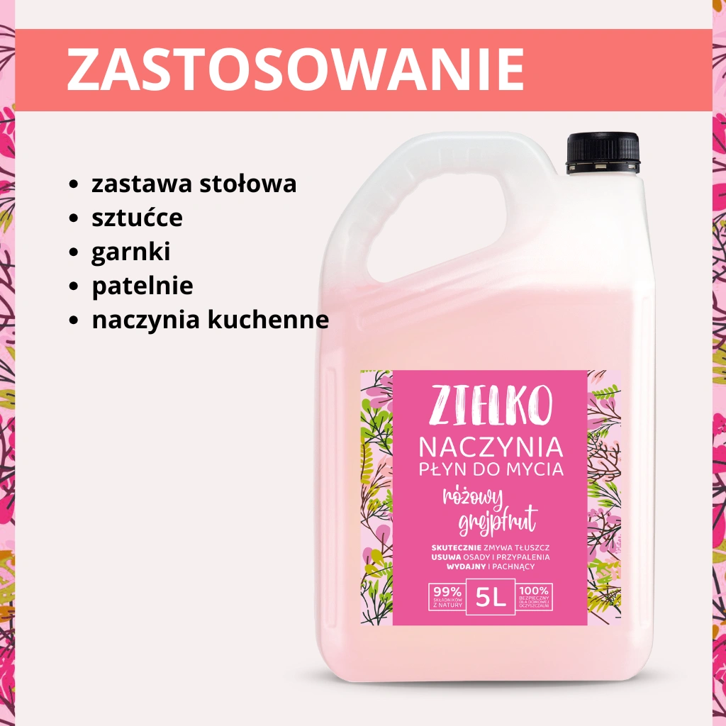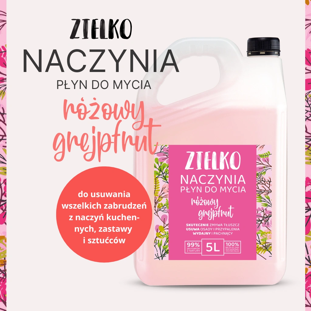 Ekologiczny płyn do mycia naczyń, dzięki swojej unikalnej formule, jest niezastąpionym pomocnikiem codziennych porządków w kuchni. Skutecznie rozprawi się z tłuszczem, brudem oraz przypaleniami na naczyniach kuchennych, zastawie stołowej i sztućcach. Posiada niezwykle przyjemny zapach różowego grejpfruta, jest delikatny dla wrażliwej skóry dłoni, nie powodując jej wysuszenia. Płyn jest w pełni bezpieczny dla wszystkich powierzchni mających kontakt z żywnością, co sprawia, że możesz bez obaw stosować go w swojej kuchni. Jego wydajność zapewnia długotrwałe użytkowanie, a przyjemny, odświeżający zapach różowego grejpfruta pozostawia uczucie czystości w całej kuchni. Ekologiczny płyn do mycia naczyń ZIELKO sprawi, że naczynia będą czyste i lśniące, a utrzymanie porządku w Twojej kuchni stanie się niezwykle łatwe i przyjemne.