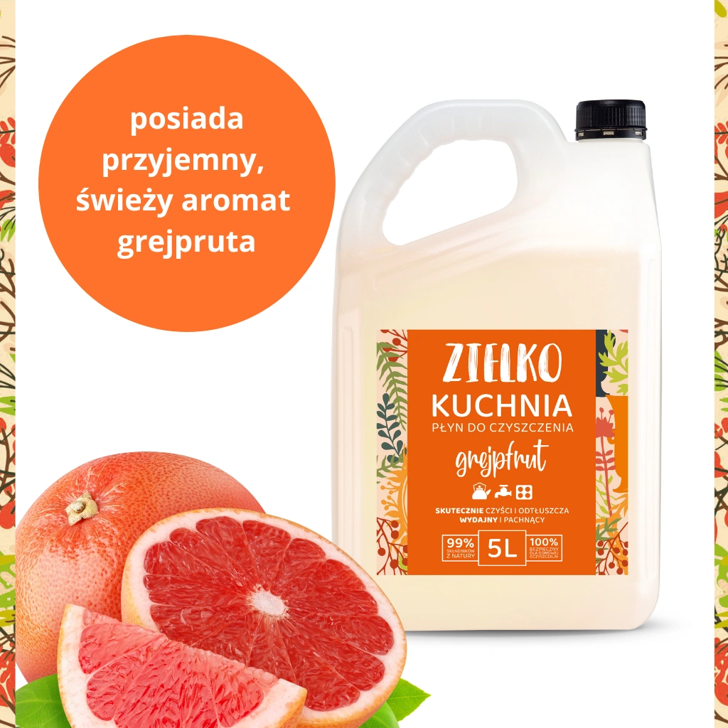 Zapomnij o duszących, chemicznych zapachach. Płyn do kuchni ZIELKO zachwyca delikatnym, naturalnym aromatem grejpfruta, który odświeża przestrzeń i pozostawia przyjemną woń na długo. Sprzątanie jeszcze nigdy nie było tak przyjemne!