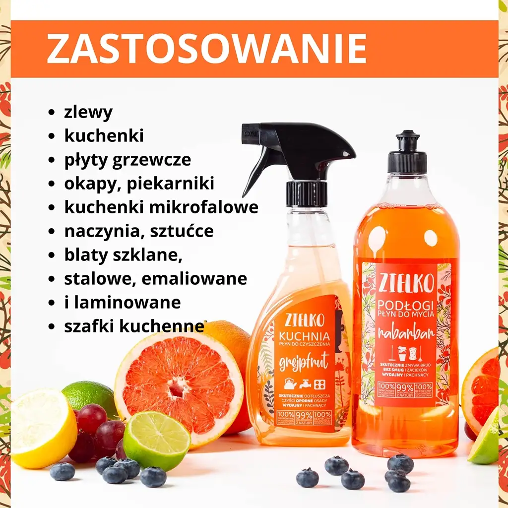 Ekologiczny płyn do kuchni ZIELKO o orzeźwiającym zapachu grejpfruta. Specjalnie opracowana formuła skutecznie i szybko radzi sobie z tłuszczem, osadami oraz przypalonymi zabrudzeniami, bez konieczności szorowania, co czyni sprzątanie łatwiejszym i przyjemniejszym. Płyn zapewnia idealną czystość, nie pozostawiając smug czy zacieków na czyszczonych powierzchniach. Jego ekologiczna formuła jest bezpieczna dla powierzchni mających kontakt z żywnością, co czyni go doskonałym wyborem dla świadomych użytkowników, dbających o siebie i swoich bliskich. Produkt jest niezwykle wydajny – niewielka ilość wystarczy, aby skutecznie oczyścić nawet najtrudniejsze kuchenne zabrudzenia. Naturalny zapach grejpfruta, na długo wypełnia kuchnię uczuciem czystości i świeżości. Płyn do kuchni ZIELKO sprawi, że codzienne porządki w Twojej kuchni staną się dla Ciebie prawdziwą przyjemnością.