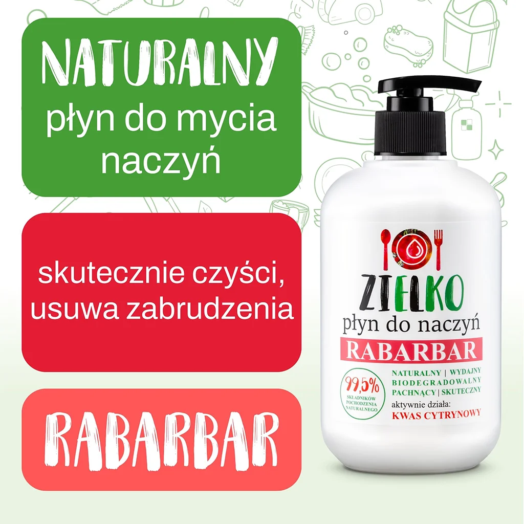 Nasz płyn jest niezwykle wydajny, co pozwala na oszczędne mycie naczyń. Oprócz jego niezwykłej skuteczności, przyciąga również świeżym zapachem rabarbaru, który wypełni przyjemnym aromatem całą kuchnię.