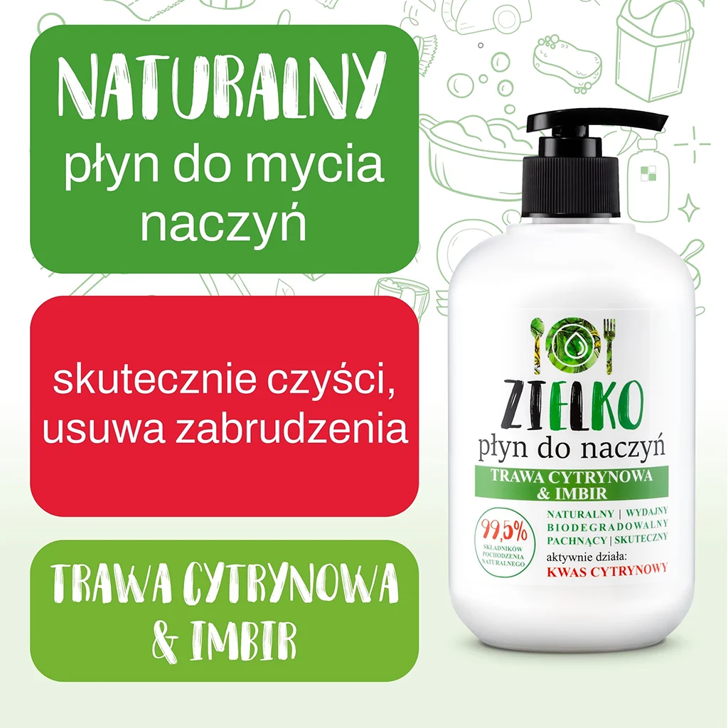 Płyn jest niezwykle wydajny, co pozwoli Ci na ekonomiczne mycie naczyń. Oprócz niesamowitej skuteczności, ZIELKO zachwyca także świeżym zapachem trawy cytrynowej i imbiru, który sprawi, że Twoją kuchnię wypełni niepowtarzalny aromat.
