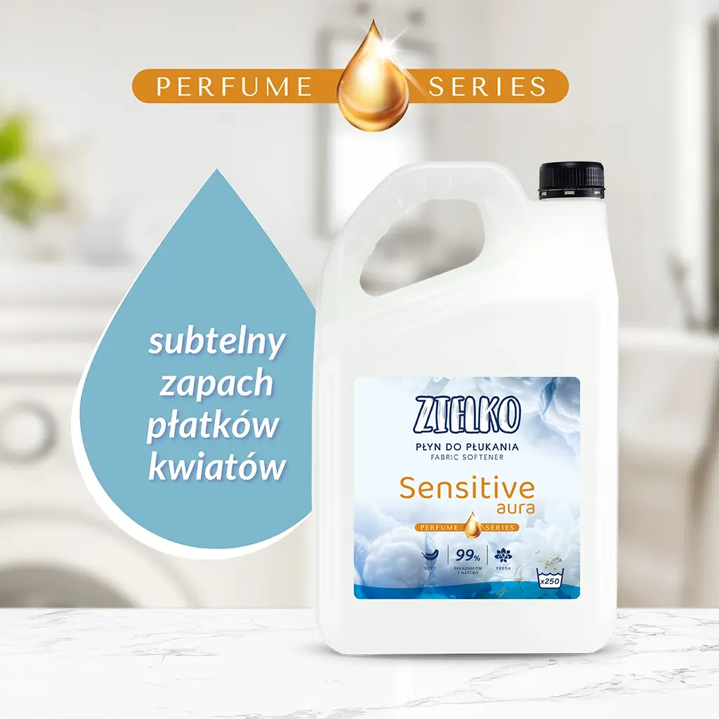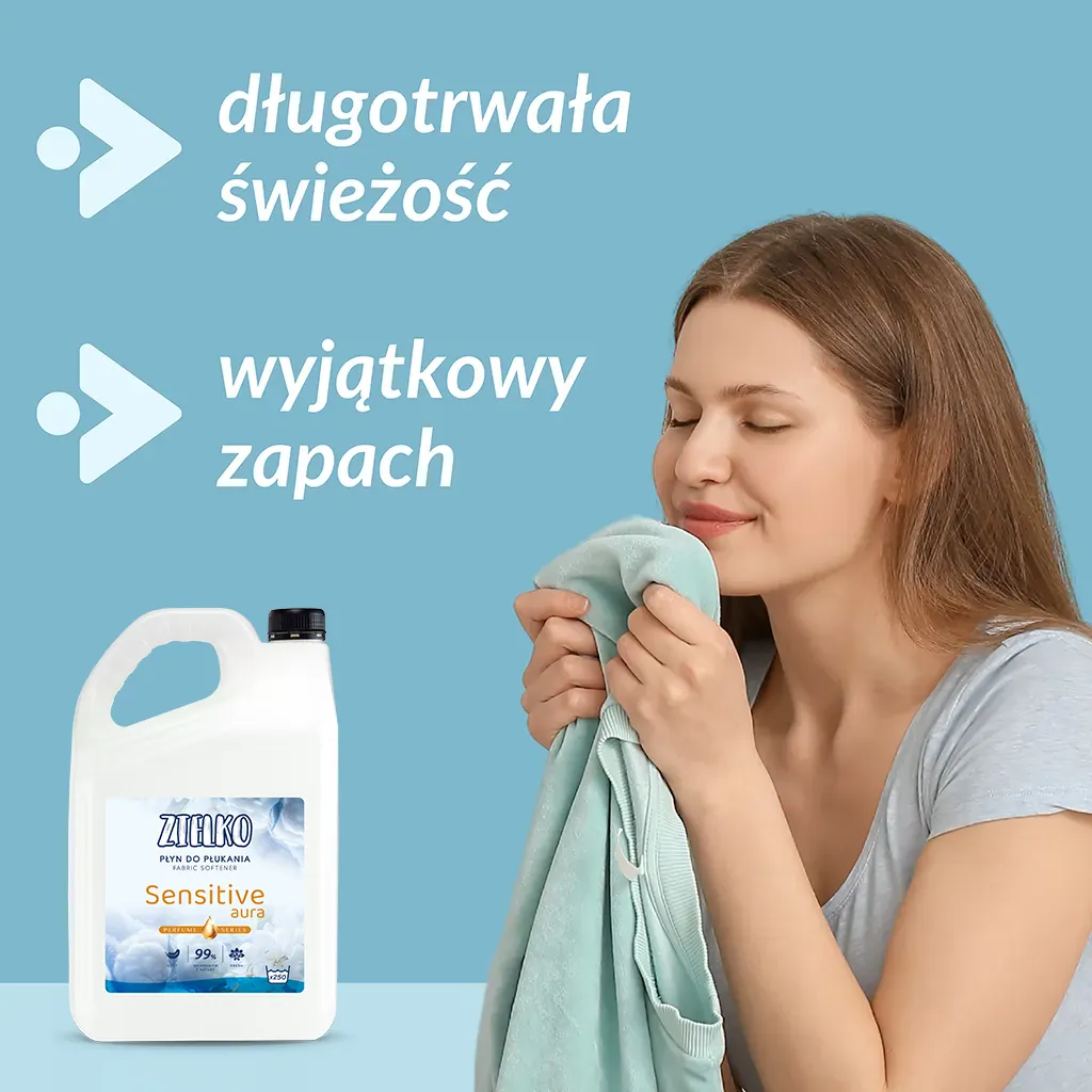 Odkryj sekret jedwabistej miękkości Twoich tkanin! Nasz płyn do płukania SENSITIVE AURA otula ubrania delikatnym, kwiatowym zapachem, inspirowanym subtelnością płatków kwiatów. To nie tylko przyjemność dla zmysłów, ale także kompleksowa ochrona Twoich ulubionych ubrań!
