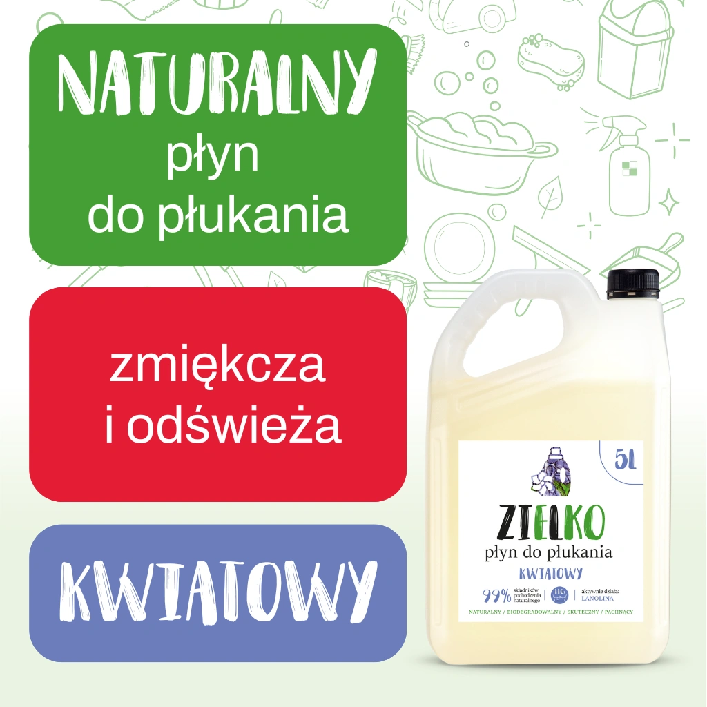 Naturalny płyn do płukania z lanoliną zmiękcza i odświeża pranie, nadając tkaninom kwiatowy zapach. Sprawia, że świeżość trwa dłużej, zapewniając płukanym materiałom piękny zapach utrzymujący się nawet przez kilka dni. Płyn do płukania ZIELKO jest całkowicie bezpieczny i przyjazny nie tylko dla ubrań, ale również dla skóry, nawet tej delikatnej i wrażliwej. Jak wszystkie produkty ZIELKO jest całkowicie biodegradowalny.