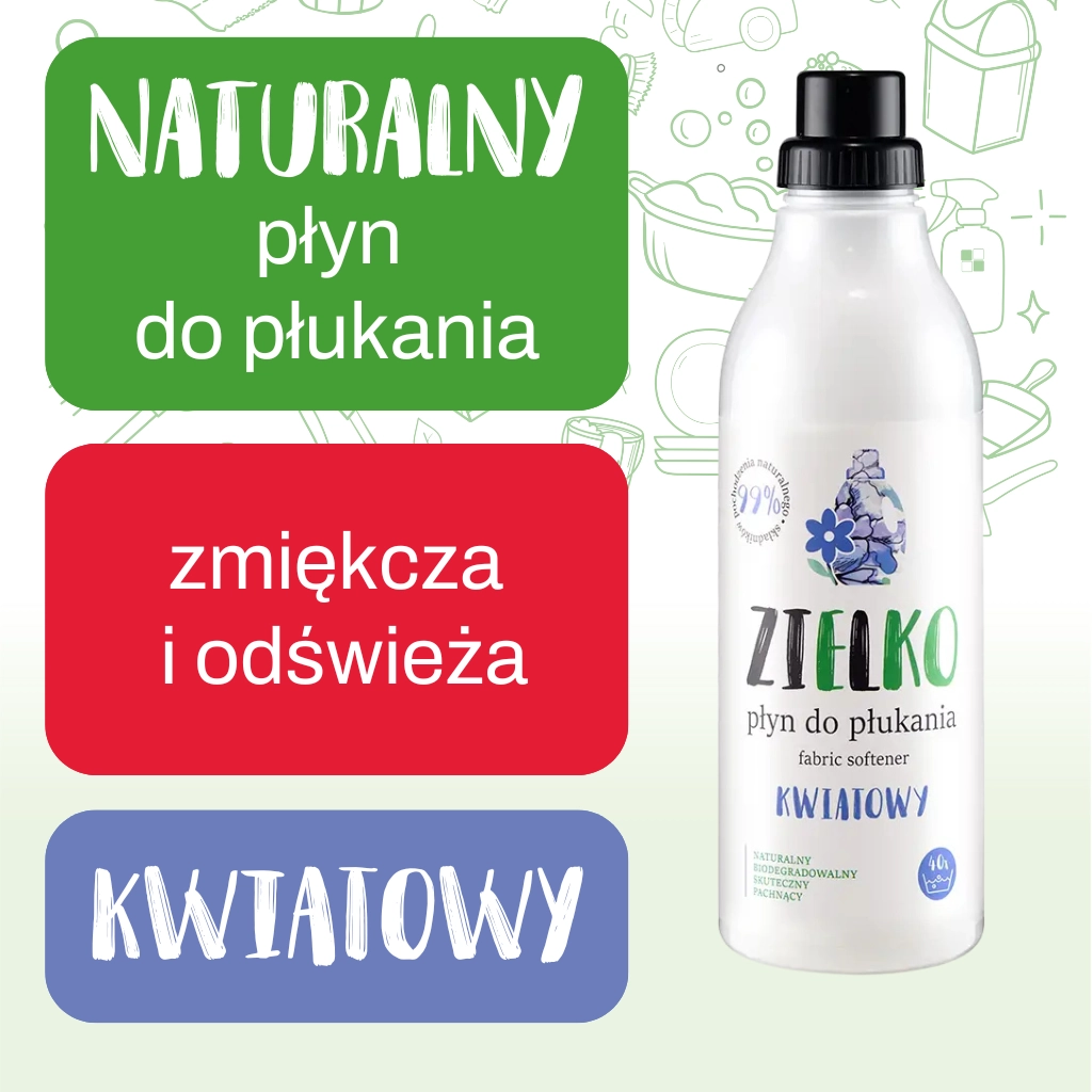 Naturalny płyn do płukania zmiękcza i odświeża pranie, nadając tkaninom kwiatowy zapach. Sprawia, że świeżość trwa dłużej, zapewniając płukanym materiałom piękny zapach utrzymujący się nawet przez kilka dni. Płyn do płukania ZIELKO jest całkowicie bezpieczny i przyjazny nie tylko dla ubrań, ale również dla skóry, nawet tej delikatnej i wrażliwej. Jak wszystkie produkty ZIELKO jest całkowicie biodegradowalny.
