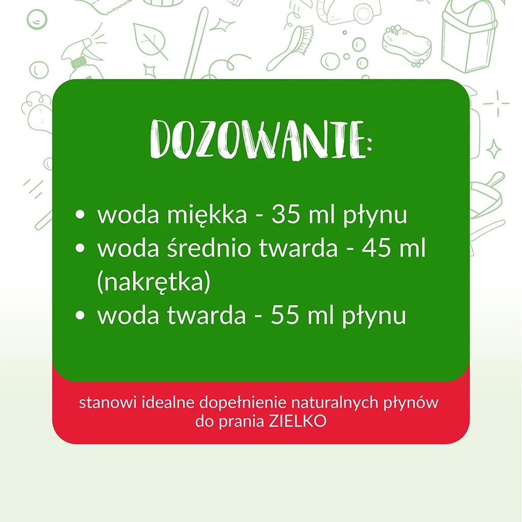 Sposób użycia | Woda miękka 35 ml płynu (ok. połowa nakrętki), Woda średnio twarda 45 ml (3/4 nakrętki), Woda twarda 55 ml płynu (pełna nakrętka) |