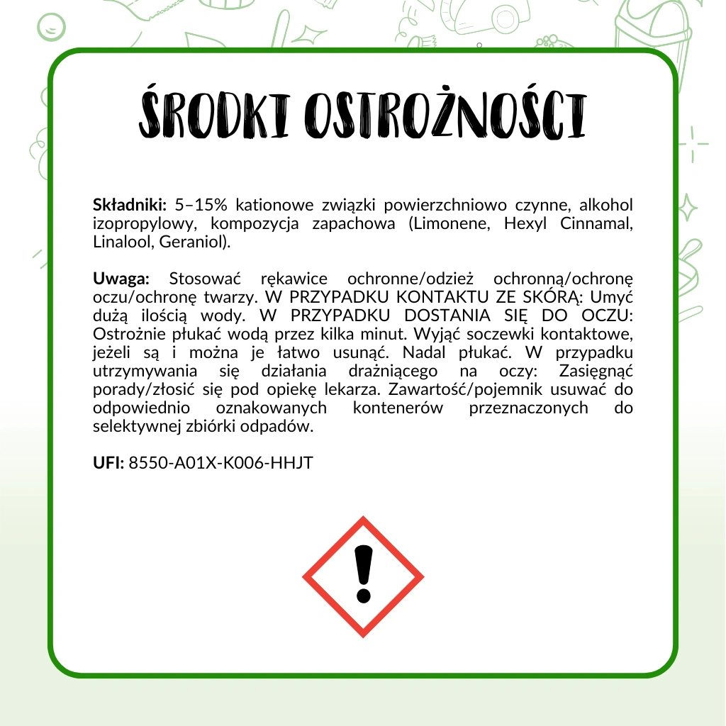 | Sposób użycia | Woda miękka 35 ml płynu (ok. połowa nakrętki), Woda średnio twarda 45 ml (3/4 nakrętki), Woda twarda 55 ml płynu (pełna nakrętka) |