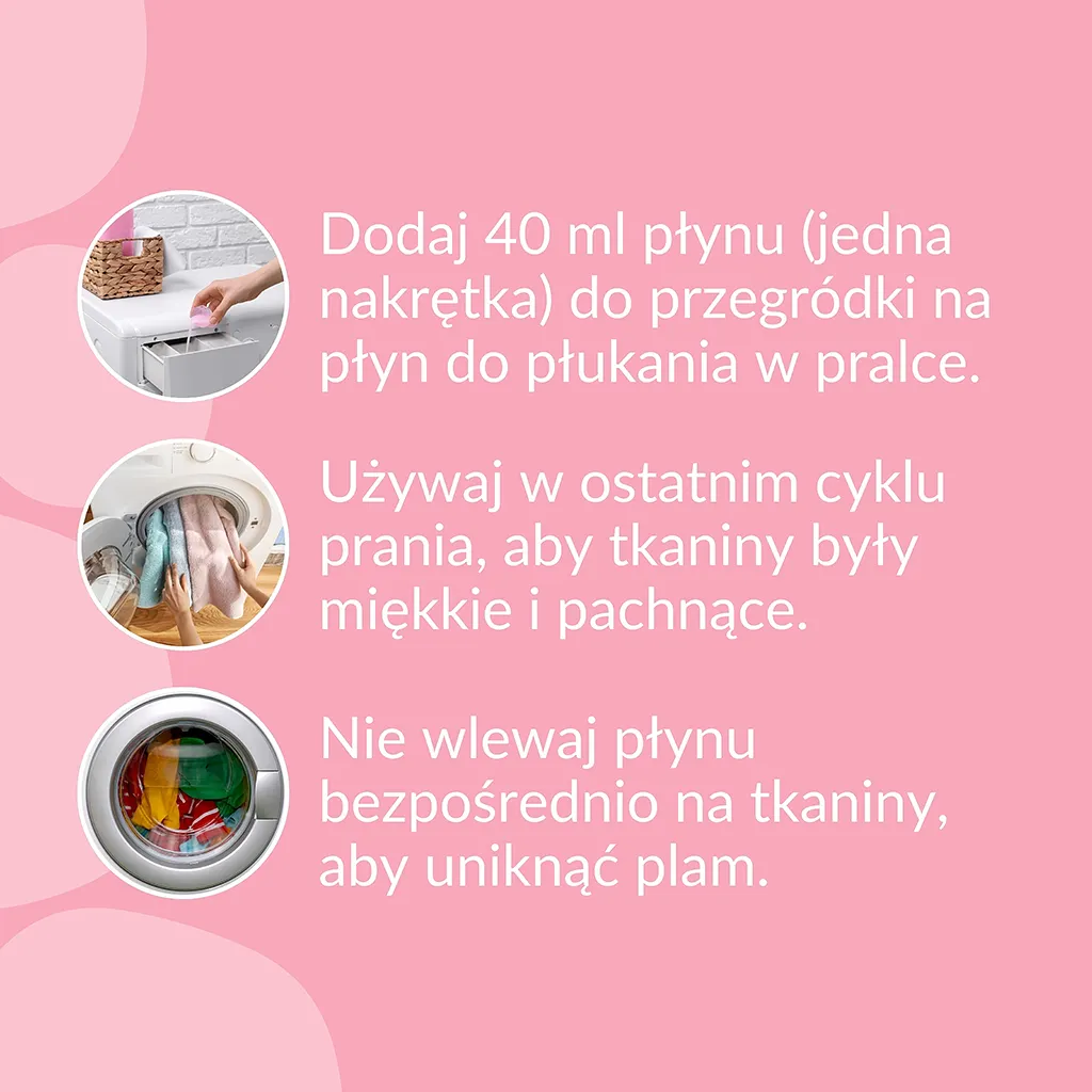 Sposób użycia: Dodaj 40 ml płynu (jedna nakrętka) do przegródki na płyn do płukania w pralce. Używaj w ostatnim cyklu prania, aby tkaniny były miękkie i pachnące.