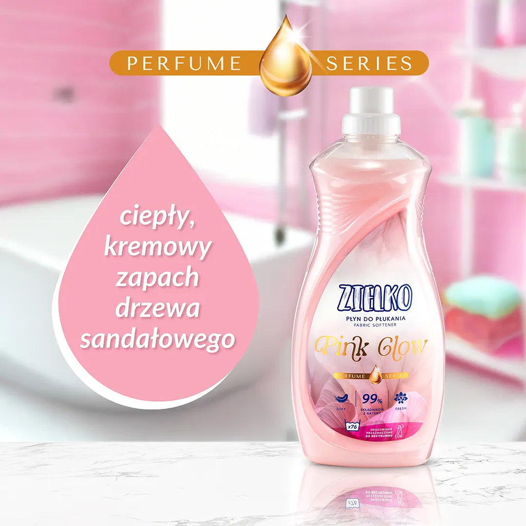 Poczuj luksusową miękkość i otulające ciepło drzewa sandałowego! ZIELKO Płyn do płukania PINK GLOW to wyjątkowa kompozycja o kremowym, eleganckim zapachu, który dodaje tkaninom zmysłowości i subtelnej słodyczy. Jego zaawansowana formuła sprawia, że ubrania stają się jedwabiście gładkie, miękkie i wyjątkowo przyjemne w dotyku.
