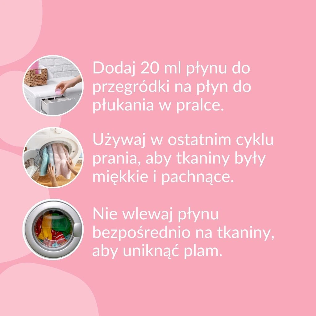 Dodaj 20 ml płynu do przegródki na płyn do płukania w pralce. Używaj w ostatnim cyklu prania, aby tkaniny były miękkie i pachnące.