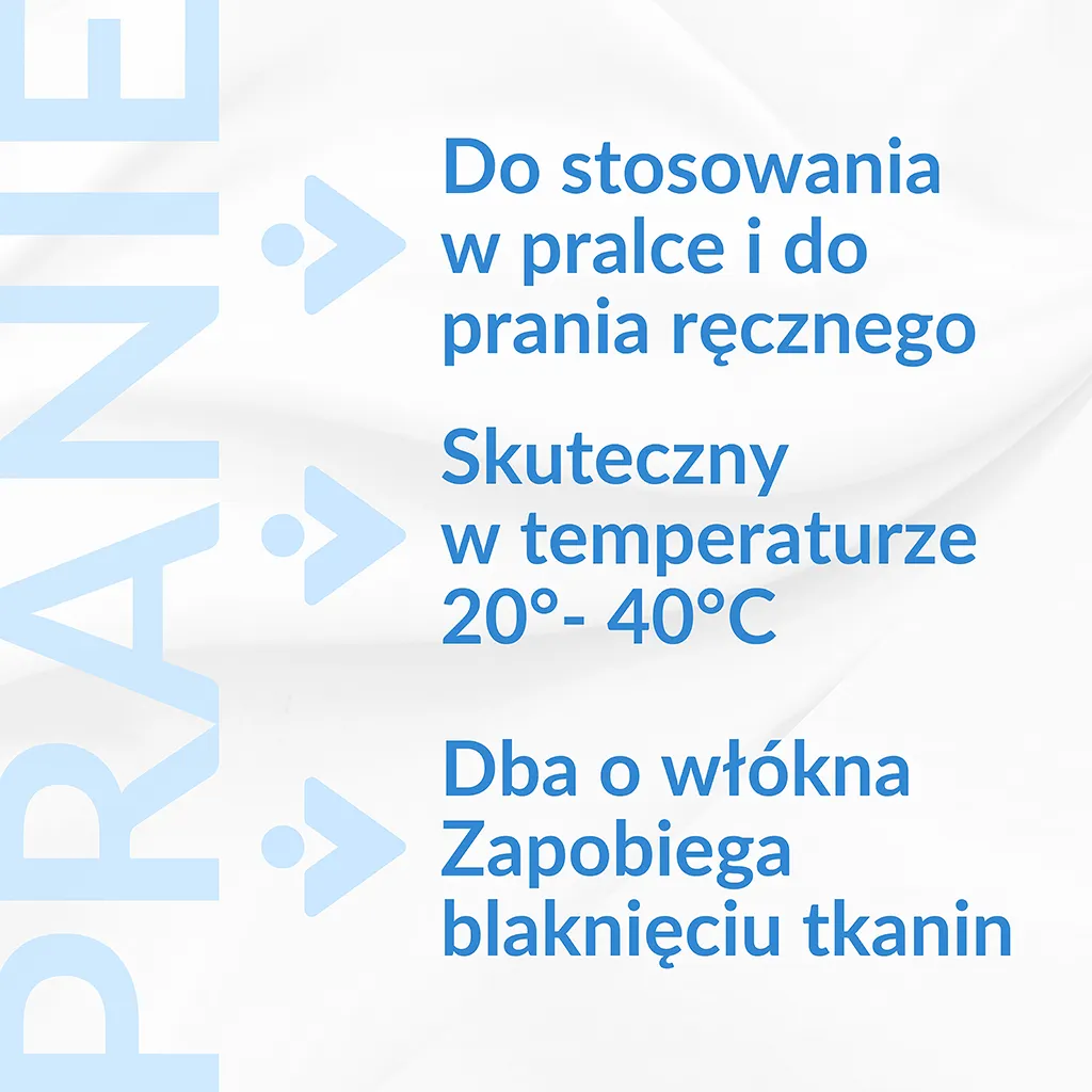Sposób użycia | Skutecznie działa w temperaturach od 20 do 60°C. Do prania w pralce wlej 40 ml (jedna nakrętka) do przegródki na detergent. Przy praniu ręcznym jedna nakrętka wystarcza na 20 l wody. |