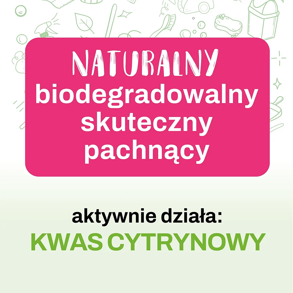 Dzięki zawartości kwasu cytrynowego płyn skutecznie usuwa zabrudzenia, osady i kamień, jednocześnie pozostawiając świeży i przyjemny zapach.