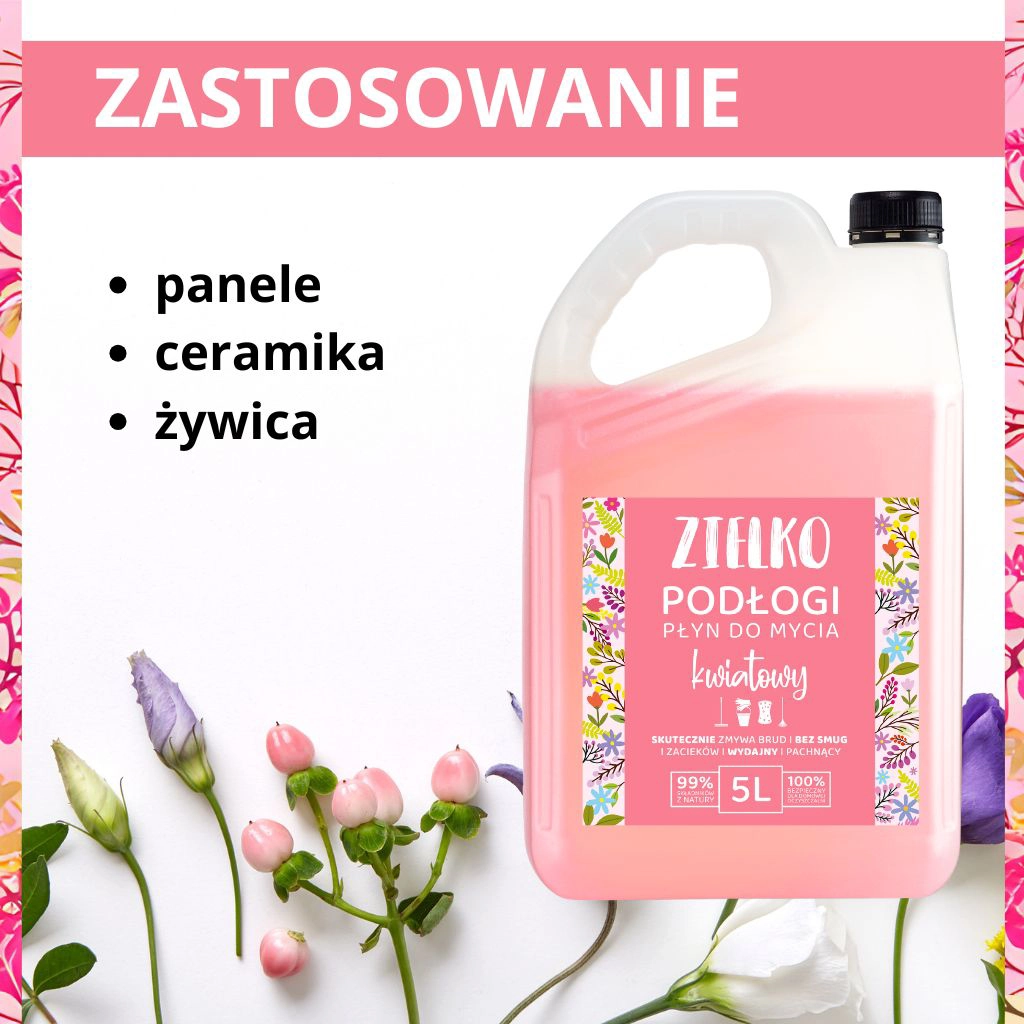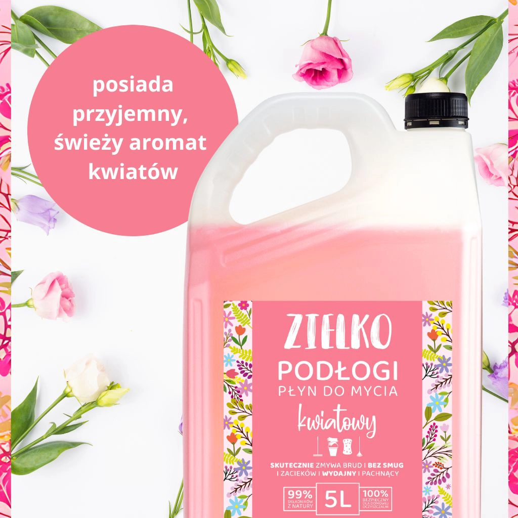 Duży format to ulga, gdy sprzątanie jest stałym elementem tygodnia. ZIELKO Kwiatowy 5L sprawdzi się tam, gdzie podłogi myje się regularnie: w większych mieszkaniach, domach z dziećmi lub zwierzętami, a także w biurach i usługach. Zamiast kupować co chwilę kolejną butelkę, masz pod ręką zapas, który wystarcza na dłużej – a to oznacza mniej przerw, mniej zamówień i więcej wygody. To także świetne rozwiązanie „organizacyjne”: jeden produkt do codziennego mycia podłóg, stała jakość efektu i zapach, do którego chętnie wracasz. Wydajność 5L to po prostu sprzątanie bez zbędnych komplikacji.