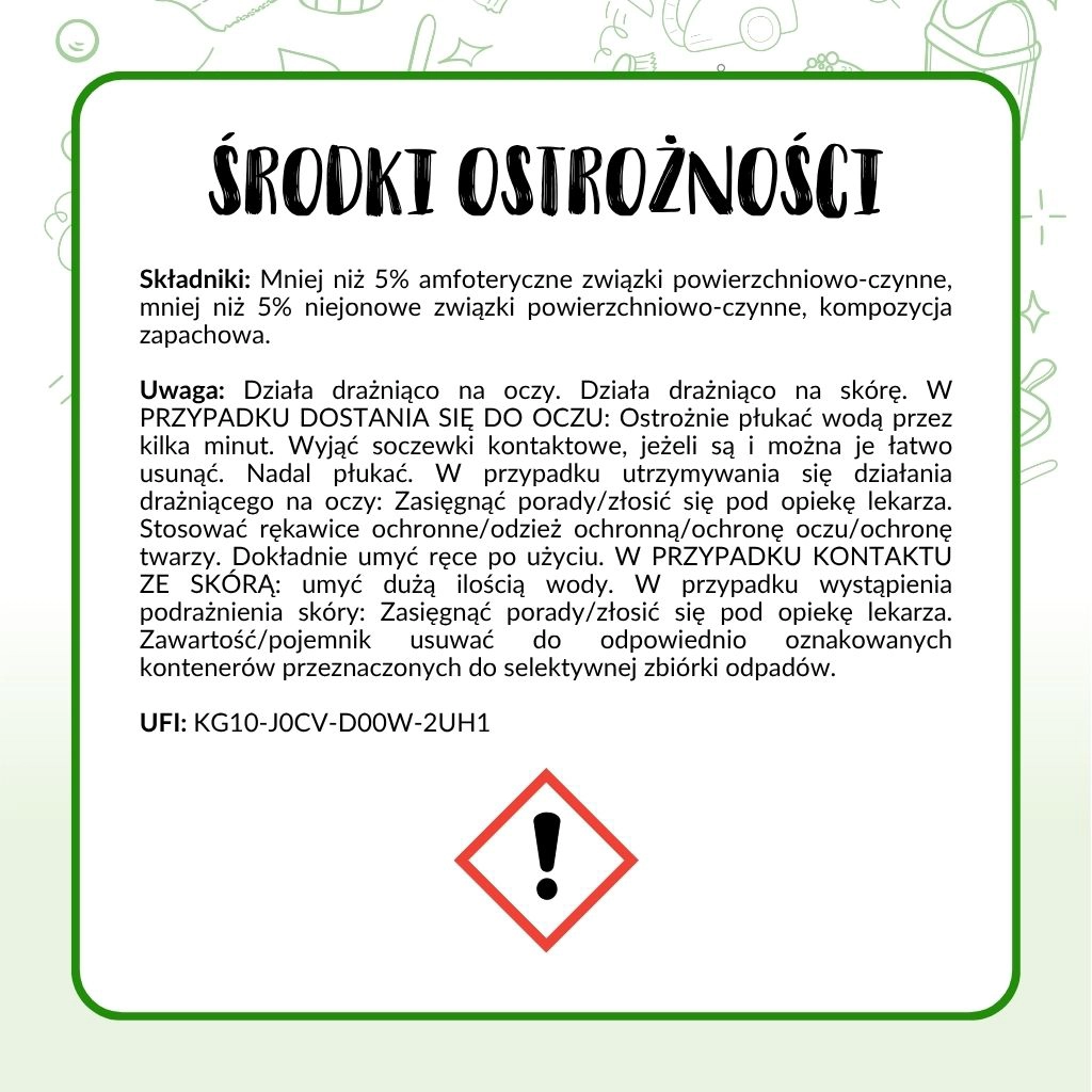 Uwaga: Działa drażniąco na oczy. W PRZYPADKU DOSTANIA SIĘ DO OCZU: Ostrożnie płukać wodą przez kilka minut. Wyjąć soczewki kontaktowe, jeżeli chcą i można je łatwo usunąć. Nadal płukać. W przypadku utrzymywania się działania drażniącego na oczy: zasięgnąć porady / zgłosić się pod opiekę lekarza. Zawartość / pojemnik usuwać do odpowiednio oznakowanych kontenerów przeznaczonych do selektywnej zbiórki odpadów. Stosować zgodnie z przeznaczeniem i sposobem użycia. Przechowywać w miejscu niedostępnym dla dzieci.